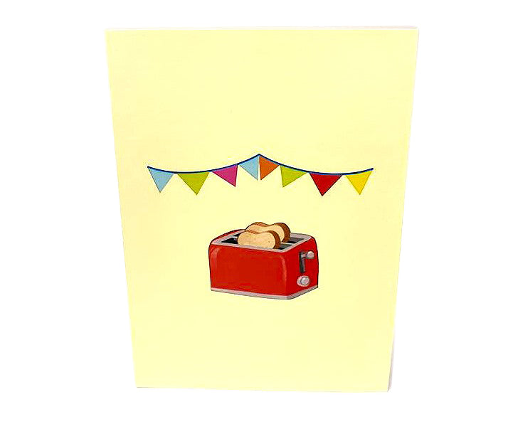 The fabulous light yellow cover of this amazing pop-up card features a cheerful red toaster illustration centered boldly — a classic shiny red toaster with two golden toast slices happily inside waiting to be popped up from the slots, surrounded by subtle sparkles and breakfast vibes that make it look warm, inviting, and full of surprise energy. Open the card to reveal an adorable 3D pop-up celebration that springs to life from the center crease: two cute anthropomorphic toast slices bursting upward with big, joyful faces, arms raised in excitement, holding a festive "Happy Birthday" sign between them!